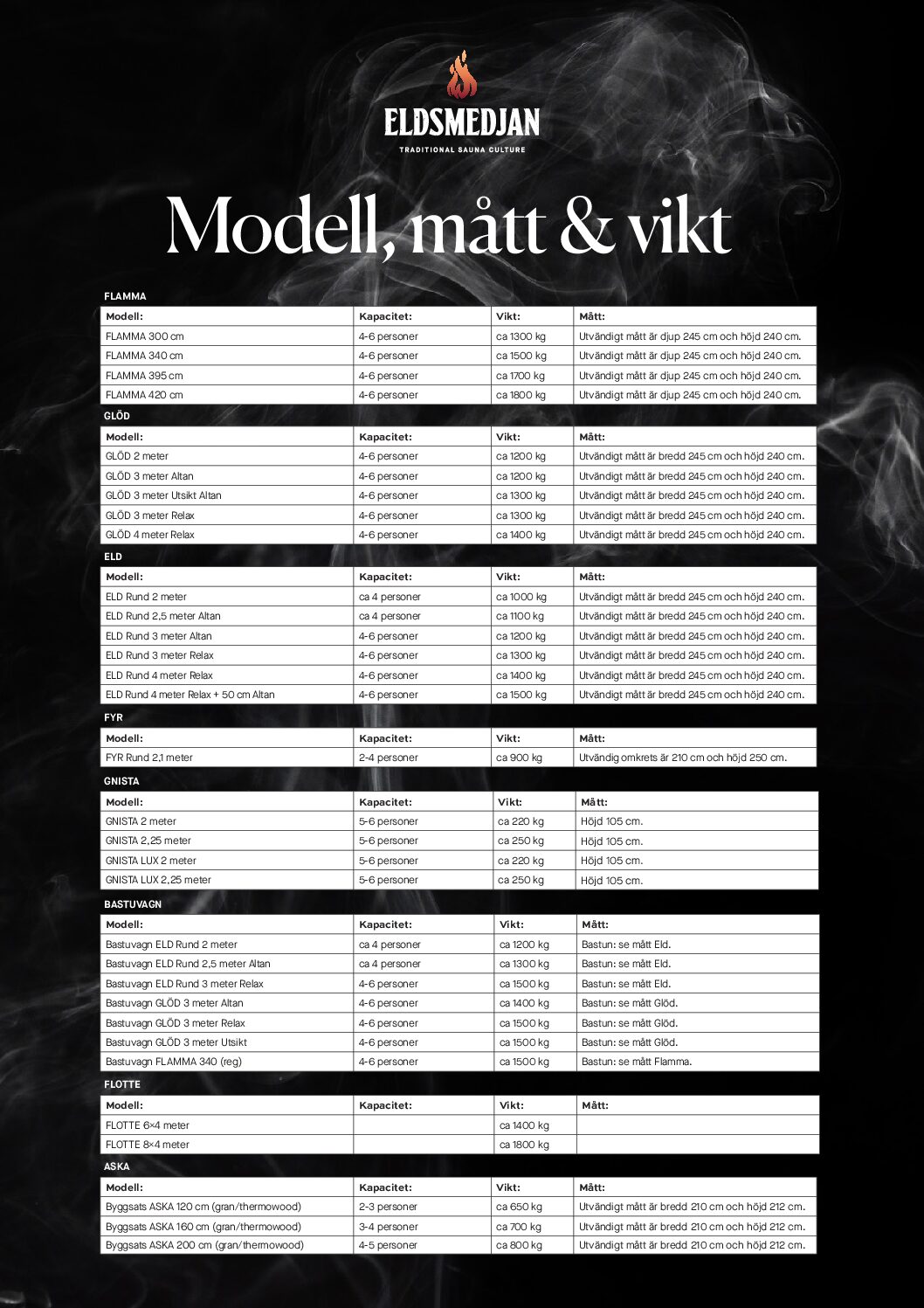 Gnista Lux Hybrid är byggd för att hålla. Den väger ca 220 kg (200 cm) eller 250 kg (225 cm), vilket ger en stabil och trygg känsla. Bottenventil och dräneringsrelä gör tömning enkel, medan rökrörsskydd och hatt på rökröret bidrar till säkerheten. Impregnerad bottenkonstruktion förhöjer livslängden ytterligare.